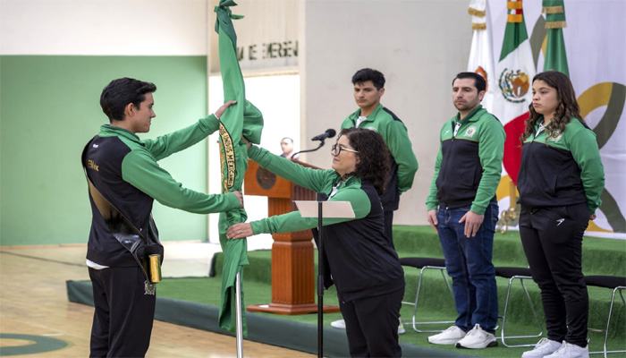 En el Gimnasio Universitario “Lic. Adolfo López Mateos”, la rectora de la UAEMéx, Martha Patricia Zarza Delgado, entregó el lábaro institucional a las y los deportistas, como símbolo de unidad e identidad universitaria.