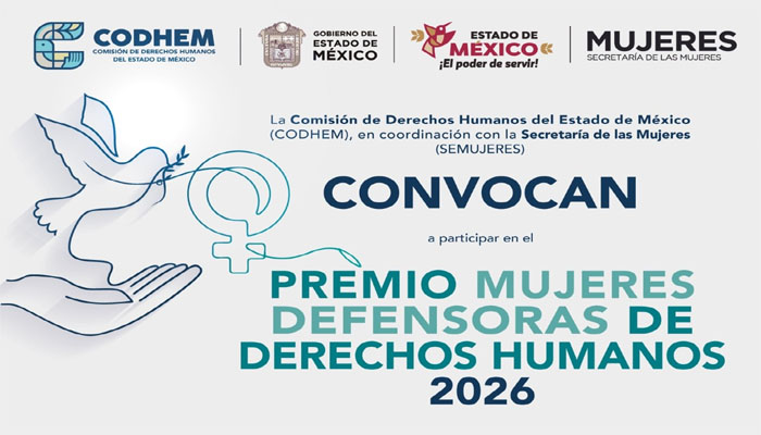 Para visibilizar el impacto positivo y significativo de mujeres que, con compromiso y vocación social, contribuyen a la construcción de una cultura de respeto, dignidad e igualdad en la entidad mexiquense, la Comisión de Derechos Humanos del Estado de México (CODHEM) y la Secretaría de las Mujeres del Estado de México (SEMUJERES) abrieron la convocatoria del “Premio Mujeres Defensoras de Derechos Humanos 2026”, cuyo objetivo es reconocer la trayectoria destacada de mujeres que, desde distintos ámbitos, impulsan acciones de promoción, divulgación, protección y defensa de los derechos humanos.