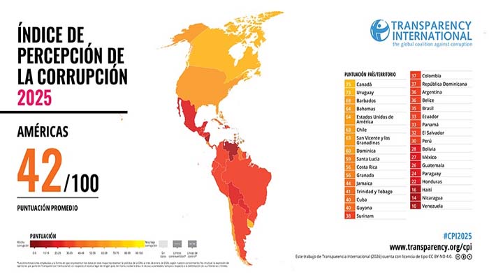 El mapa anticorrupción del continente vuelve a encender las alertas y México aparece en la parte baja del tablero con apenas 27 puntos, una calificación que lo ubica entre los países sin avances reales para frenar este fenómeno, de acuerdo con el Índice de Percepción de la Corrupción (IPC) 2025, difundido este día por Transparencia Internacional. El promedio regional tampoco ofrece consuelo es de 42 de 100, una señal clara de estancamiento.