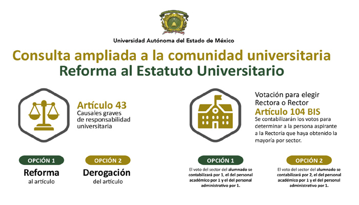 Lo que se contempla someter a consulta es la reforma o derogación del artículo 43, el cual establece que “son causales graves de faltas a la responsabilidad universitaria: suspender en forma violenta o pacífica, en todo o en parte, las actividades de la Universidad, de un Organismo Académico, Centro Universitario, Dependencia Académica, Plantel de la Escuela Preparatoria, dependencia de la Administración Central o de cualquier otro espacio universitario”.