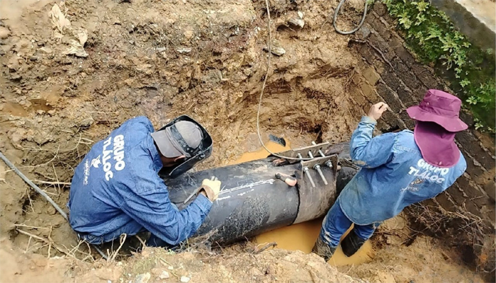 Los trabajos de reparación de las fugas, a cargo de Grupo Tláloc, en las localidades de Los Berros Cuentla, municipio de San Simón de Guerrero, y Real de Arriba, en la demarcación de Temascaltepec, consistieron en soldar las fisuras que presentaba la tubería de acero de 20 pulgadas de diámetro, lo que permitió reconducir 350 litros por segundo de agua procedente del manantial.
