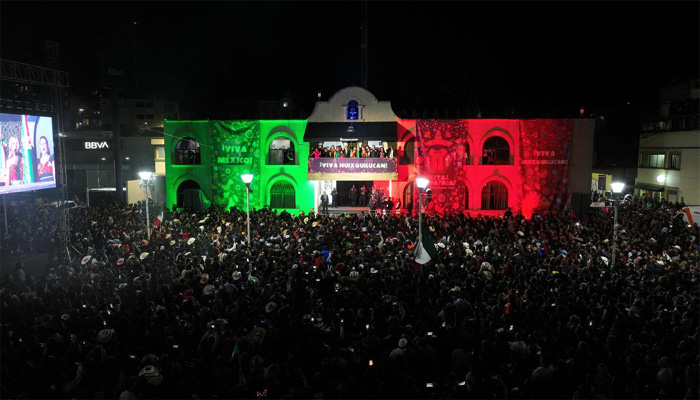 Posteriormente, los asistentes acompañaron a Romina Contreras con sus ¡Vivas!, al tiempo en que la alcaldesa ondeó la bandera nacional y tocó la campana desde el balcón del Palacio Municipal, para dar paso a un espectáculo de luces y pirotecnia de más de 11 minutos que iluminaron el cielo en la noche del 15 de septiembre, como recordatorio de que México es un país libre, la cual se logró por la valentía de mujeres y hombres que participaron en este movimiento.