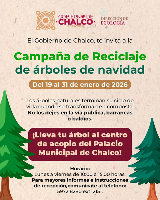 Como parte de estas acciones, la Dirección de Ecología del Gobierno de Chalco invita a todas y todos, a su “Campaña de Reciclaje de los arbolitos de navidad”, que serán recibidos en las instalaciones del Palacio Municipal donde previas indicaciones, se podrán entregar sus arbolitos navideños naturales que ya concluyeron su vida útil, con el objetivo de darles un destino adecuado a través del reciclaje y evitar que sean desechados de manera incorrecta.