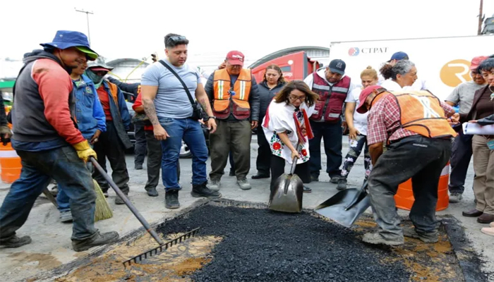 La alcaldesa Azucena Cisneros Coss supervisó obras del Bachetón en la colonia Cuauhtémoc Xalostoc, donde anunció que el gobierno municipal incrementará el bacheo y la repavimentación de calles de Ecatepec en el segundo semestre de este año.