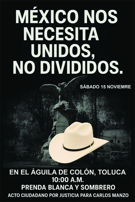 La concentración está programada a las 10:00 de la mañana en el Monumento a El Águila de Colón, ubicado en Toluca. Los organizadores solicitan a los asistentes portar prendas de color blanco y sombrero, como símbolo de unión y de una manifestación pacífica.