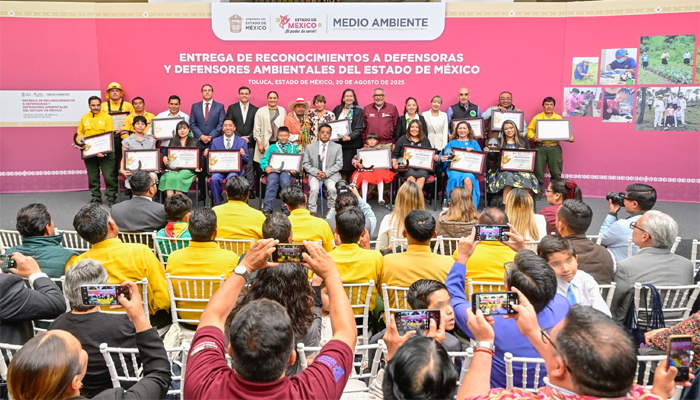 La Gobernadora Delfina Gómez Álvarez encabezó la primera Entrega de Reconocimientos a Defensoras y Defensores Ambientales del Estado de México, iniciativa que reconoce el compromiso de ciudadanas y ciudadanos que, con esfuerzo y amor por la naturaleza, protegen los bosques, restauran ecosistemas y defienden a la flora, la fauna y a los seres sintientes.
