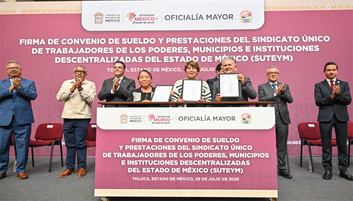 A fin de dar certeza laboral y seguridad económica de las familias mexiquenses, la Gobernadora Delfina Gómez Álvarez firmó el Convenio de Sueldo y Prestaciones 2025 con el Sindicato Único de Trabajadores de los Poderes, Municipios e Instituciones Descentralizadas del Estado de México (SUTEyM), en beneficio de más de 43 mil trabajadores. El acuerdo contempla un incremento salarial directo al tabulador y la mejora de diversas prestaciones clave.