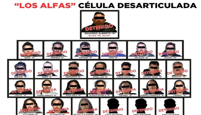 Durante una serie de operativos coordinados por la Secretaría de Seguridad y Protección Ciudadana (SSPC), la Secretaría de Seguridad del Estado de México (SSEM), la Dirección de Seguridad Pública de Toluca y la Fiscalía General de Justicia del Estado de México (FGJEM), fueron detenidas 27 personas, entre ellas su presunto líder, Eduardo Alberto “N”, alias “El Alfa”, exelemento de la policía de Michoacán y señalado como generador de violencia en la región.