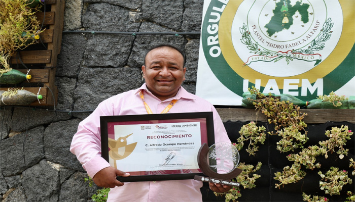 Alfredo Ocampo Hernández, docente y responsable del Programa de Medio Ambiente del Plantel “Isidro Fabela Alfaro” de la Escuela Preparatoria de la Universidad Autónoma del Estado de México (UAEMéx) -ubicado en el municipio de Atlacomulco-, recibió el Reconocimiento a Defensoras y Defensores Ambientales, en la categoría Académico Defensor, que entrega el Gobierno del Estado de México, a través de la Secretaría del Medio Ambiente y Desarrollo Sostenible.