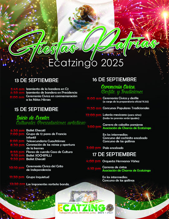 Finalmente, el alcalde precisó que “Con este programa, Ecatzingo se prepara para vivir una de las celebraciones más significativas del calendario nacional, en un ambiente de unidad, identidad y orgullo mexicano, donde la comunidad podrá disfrutar de una amplia variedad de eventos que fortalecen sus tradiciones y valores patrios”, concluyó.