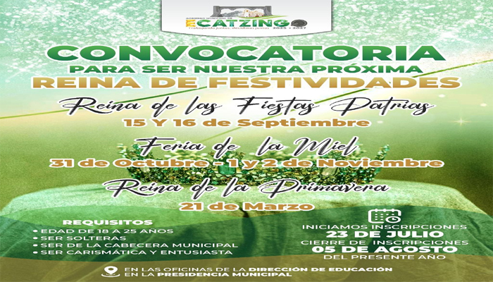 Las interesadas podrán participar en los concursos para elegir a La Reina de las Fiestas Patrias 2025; La Reina de la Feria de la Miel 2025; y La Reina de La Primavera 2026, cumpliendo los requisitos considerados en la Convocatoria emitida por las autoridades Municipales, así como acudiendo a Registrarse en las fechas establecidas.