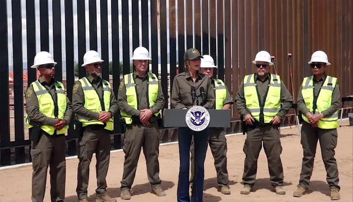 “Es alto, lo que lo hace muy, muy difícil de escalar, casi imposible. También se hunde profundamente en el suelo, lo que haría muy difícil, si no imposible, cavar por debajo. Y hoy también vamos a pintarlo de negro”, dijo Noem durante una visita a la sección del muro en Santa Teresa, Nuevo México. “Eso es específicamente a solicitud del presidente, quien entiende que, con las altas temperaturas aquí, cuando algo se pinta de negro, se calienta aún más, y hará que sea todavía más difícil para la gente escalarlo”, añadió. Incluso tomó un rodillo para ayudar con la pintura.