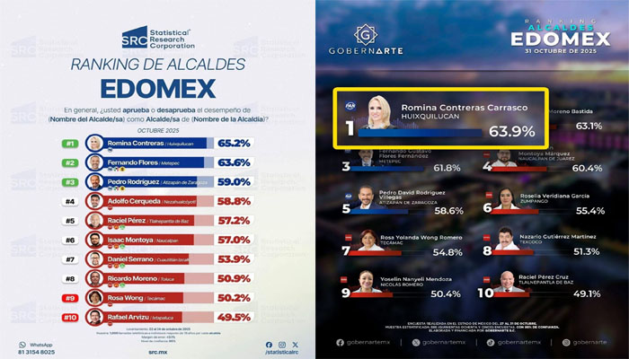 De acuerdo con el Ranking de Alcaldes del Edomex de las encuestadoras Gobernarte y La Encuesta MX, correspondientes al mes de octubre, Romina Contreras se coloca en el primer lugar de estas mediciones, con una calificación de 63.9 por ciento y 60.1 por ciento, respectivamente.