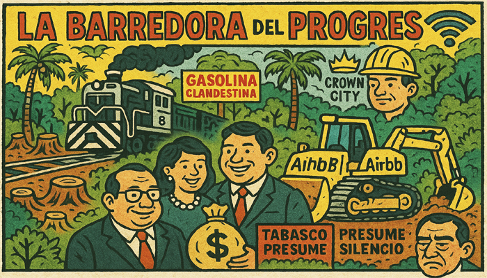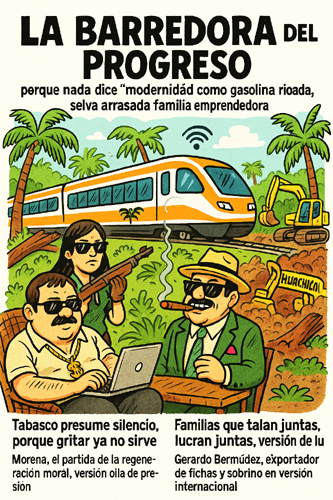 La Barredora del Progreso, porque nada dice “modernidad” como gasolina robada, selva arrasada y familia emprendedora.