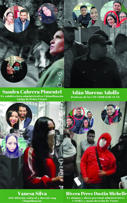 Además de Pedro Vizuet López, excoordinador general de la Unidad Académica Profesional (UAP) de Chimalhuacán, también identificaron a varios de sus allegados, entre ellos Fátima, alumna e integrante de la Asamblea Estudiantil de Chimalhuacán; Sandra Cabrera, exsubdirectora administrativa; Vanesa Silva, jefa de Difusión Cultural y docente; al profesor Adán Moreno y al trabajador administrativo, Dustin Michelle Rivera, todos adscritos a la UAP Chimalhuacán.