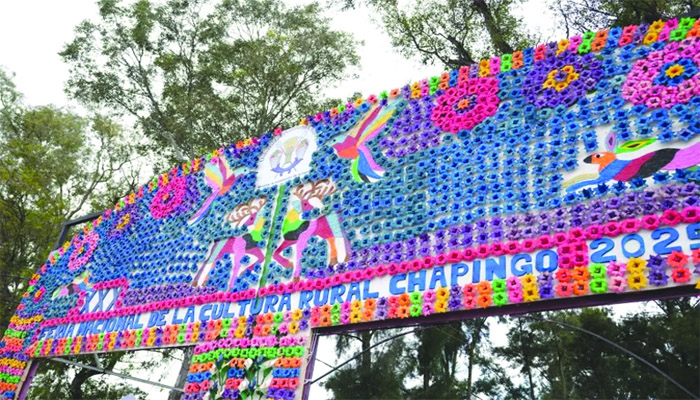 Un arco floral hecho con madera reciclada y casi dos mil azucenas y alcatraces adorna la entrada de la XXX Feria Nacional de la Cultura Rural en la Universidad Autónoma Chapingo, donde artesanos otomíes de Temoaya muestran la fuerza de sus raíces.