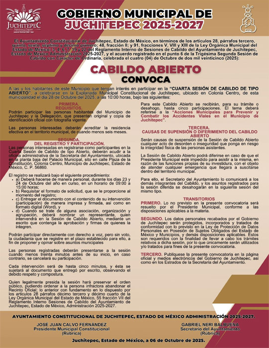 Con esta convocatoria, el Gobierno de Juchitepec reafirma su compromiso con la participación ciudadana, la transparencia y el trabajo conjunto para mejorar la calidad de vida en todas las comunidades del municipio.