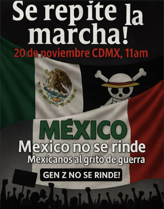 La convocatoria establece que la movilización se realizará el 20 de noviembre a las 11:00 horas, replicando el mismo punto de partida utilizado el pasado sábado en las más de 50 ciudades donde se llevó a cabo la primera jornada. En el caso de la Ciudad de México, la cita será en la Glorieta del Ángel de la Independencia, sobre Paseo de la Reforma, para avanzar nuevamente hacia el Zócalo capitalino.