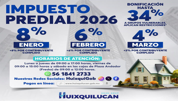 Durante el primer trimestre de 2026, el Gobierno de Huixquilucan pone en marcha la campaña de descuentos y bonificaciones por pronto pago del impuesto predial, con el objetivo de apoyar la economía de las familias que cuentan con un patrimonio destinado a casa-habitación.