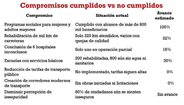 Sin embargo en materia de infraestructura los avances son insuficientes, al inicio del sexenio se anunció la rehabilitación de mil kilómetros de carreteras pero hasta la fecha se han intervenido apenas 320 kilómetros y con constantes quejas ciudadanas por la mala calidad de los trabajos, en salud la gobernadora prometió concluir seis hospitales heredados en obra negra por anteriores gobiernos, sin embargo solo uno ha tenido avances parciales mientras que los otros permanecen detenidos por falta de presupuesto y problemas legales en los terrenos.
