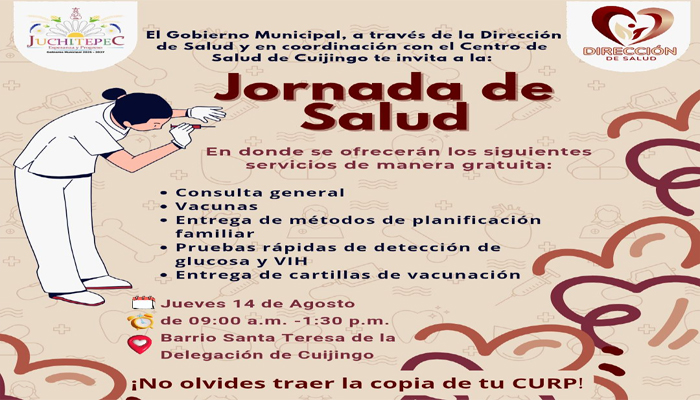 El Gobierno Municipal que preside el alcalde José Juan Calvo Fernández, junto con la Dirección de Salud, en coordinación con el Centro de Salud de la Delegación San Matías Cuijingo, hacen la atenta invitación a toda la población, para participar en la Jornada de Salud gratuita, que se llevará a cabo en el Barrio Santa Teresa de esta comunidad, el próximo jueves 14 de agosto, en un horario de las 09:00 a las 13:30 horas.