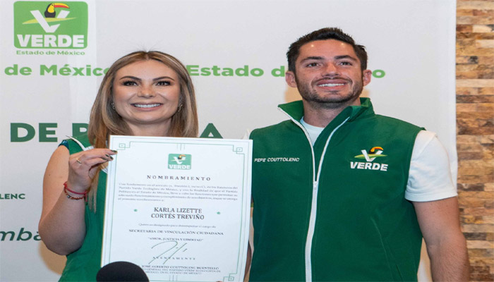 El Partido Verde Ecologista de México en el Estado de México oficializó la incorporación de Karla Cortés Treviño como nueva secretaria de Vinculación Ciudadana, luego de más de 26 años de militancia en el PRI, la exfuncionaria priista fue presentada por el dirigente estatal del Verde, José Alberto Couttolenc Buentello, quien destacó que su llegada fortalece el crecimiento del partido rumbo a las elecciones estatales y federales de 2027.