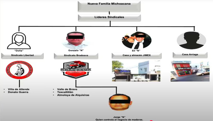 Cervantes Martínez añadió que para controlar el sector de la construcción la organización criminal disolvió las organizaciones de transportistas que operaban en la región y conformó organizaciones como el “Sindicato Libertad” y el “Sindicato Bradosva”, los cuales se encargaban de la venta de material en los municipios de Villa de Allende, Donato Guerra, Valle de Bravo y Texcaltitlán, entre otros.