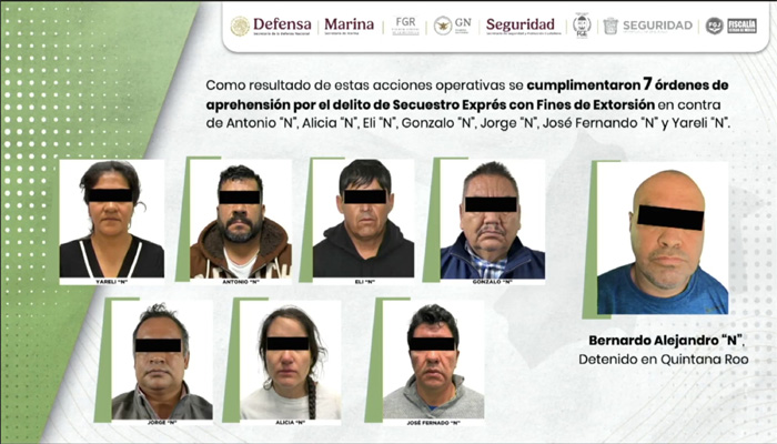 Indicó que sobre quienes pesaba una orden de aprehensión y que fueron detenidos en este operativo, figuran Bernardo Alejandro “N”, detenido en Quintana Roo; además de Antonio “N”, Alicia “N”, Eli “N”, Gonzalo “N”, Jorge “N”, José Fernando “N” y Yareli “N”, quienes presuntamente están relacionados con prácticas extorsivas en minas, comercializadoras, distribuidoras de materiales de construcción, ferreterías, criaderos de pollo, cerdo y otros semovientes (animales vivos), huevo y cárnicos, entre otras unidades económicas.