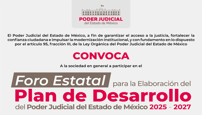A fin de fortalecer la confianza ciudadana e impulsar la modernización institucional, se llevará a cabo el Foro Estatal para la elaboración del Plan de Desarrollo del Poder Judicial del Estado de México 2025-2027, a través de un esquema plural e incluyente, en el que podrá intervenir la ciudadanía en general interesada en el fortalecimiento de la justicia.