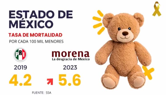 De acuerdo con la líder priista, en el Estado de México la tasa de mortalidad por cáncer infantil pasó de 4.2 por cada 100 mil menores en 2019 a 5.6 en 2023, a lo que la le tribuyó este incremento al “desmantelamiento del sistema de salud” durante el gobierno del expresidente Andrés Manuel López Obrador.