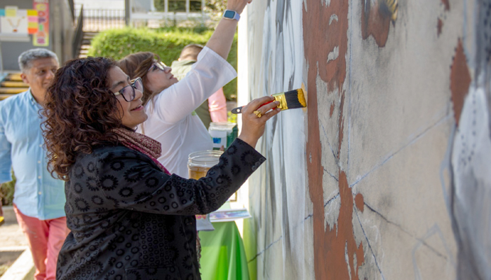 En un acto simbólico, la rectora participó en la primera pincelada, acompañada de estudiantes del Plantel, quienes además fungieron como modelos incorporados en la obra, así como de ex directores de la preparatoria, para poner colores verde y oro en el mural.
