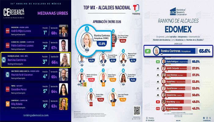Asimismo, en el Ranking de Alcaldes de México, Medianas Urbes de Campaigns and Elections (C&E) Research, Romina Contreras obtuvo una puntuación de 66 por ciento, lo que coloca a Huixquilucan entre los tres municipios mejor calificados del país y es el que tiene mayor aprobación ciudadana en el Estado de México.