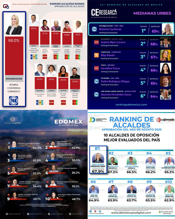 A estas cifras, se suman las de Demoscopia Digital que, en el Ranking de Alcaldes correspondiente al mes de agosto, colocó a Romina Contreras con una calificación de 67.9 por ciento en cuanto aprobación ciudadana, la más alta en comparación con los presidentes municipales del país incluidos en esta encuesta. Mientras que, la agencia consultora Gobernarte, la posicionó en el primer lugar de la entidad, con un puntaje de 64 por ciento.