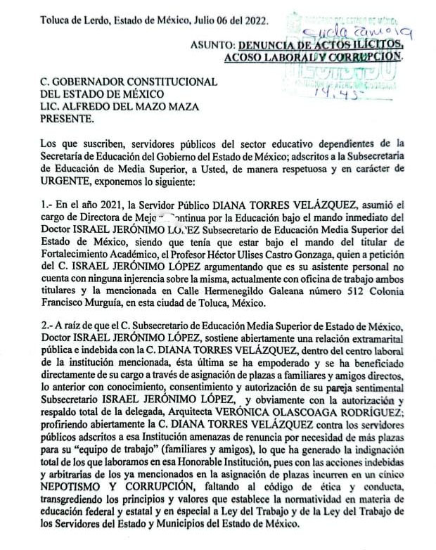 El nombre de Israel Jerónimo López se ha convertido en un sinónimo de nepotismo, corrupción y privilegios institucionales, pues a pesar de inconsistencias como el uso indebido del título de “Doctor” dos años antes de obtener su cédula y la expedición irregular de sus propios registros académicos desde el área que actualmente dirige, ahora se suman evidencias de denuncias formales que fueron presentadas en 2022 por servidores públicos del Estado de México en diferentes instancias gubernamentales, sobre el manejo discrecional de cargos y favores personales cuando fue subsecretario de Educación Media Superior en la entidad.