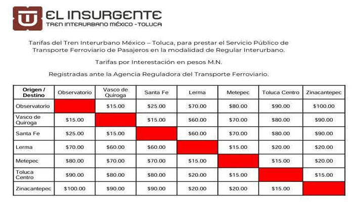 De acuerdo con las autoridades del Tren ‘El Insurgente’, se establecerán diversas tarifas dependiendo el número de estaciones recorridas. La primera tarifa costará 15 pesos para aquellos usuarios que recorran UNA estación dentro de la Ciudad de México o el Estado de México.