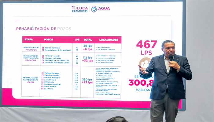 También informó avances del Plan Hídrico implementado en la capital mexiquense, donde reporto que, en lo que va de la administración se han rehabilitado 41 pozos, lo que ha permitido recuperar un caudal de 209 litros por segundo de agua, en beneficio de más de 630 mil personas, sin considerar el suministro proveniente del Sistema Cutzamala.