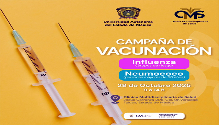 Con el propósito de prevenir enfermedades respiratorias durante la temporada invernal, la Clínica Multidisciplinaria de Salud (CMS) de la Universidad Autónoma del Estado de México (UAEMéx) lanzó su Campaña de Vacunación contra Influenza y Neumococo, dirigida a la comunidad universitaria y al público en general.